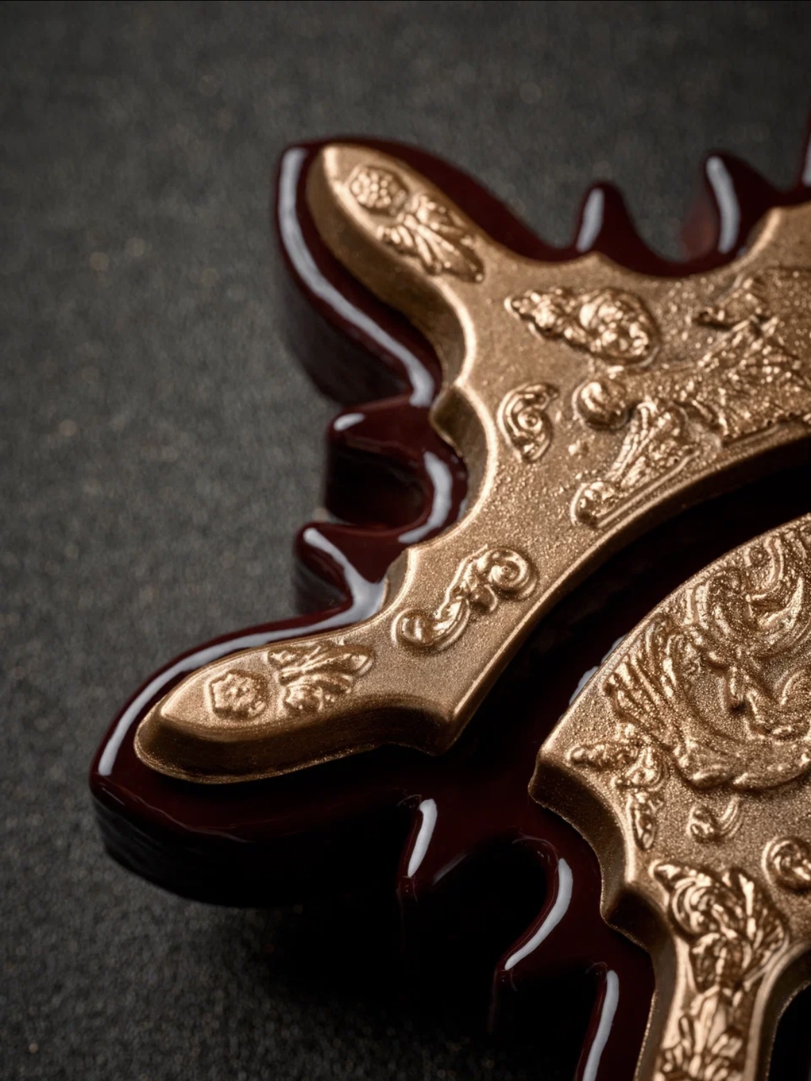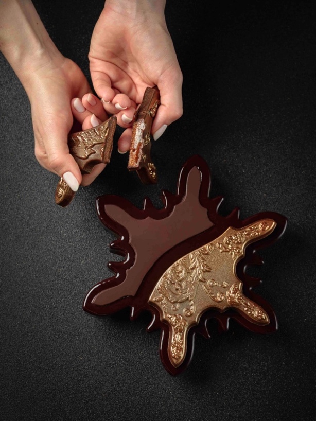 Дуэт талантливых и профессиональных шефов разработал уникальный рецепт десерта схрустящим какао и Флёр де сель. Сверху слоя песочного теста лежит мягкий шоколадный бисквит, сладость которого эффектно контрастирует с более интенсивными нотками крема, приготовленного с использованием гречневой крупы, и сливочной карамели на базесоленого сливочного масла. В качестве украшения рождественского полена был использован шоколадный мусс Гран-Крю с богатым и глубоким вкусом.