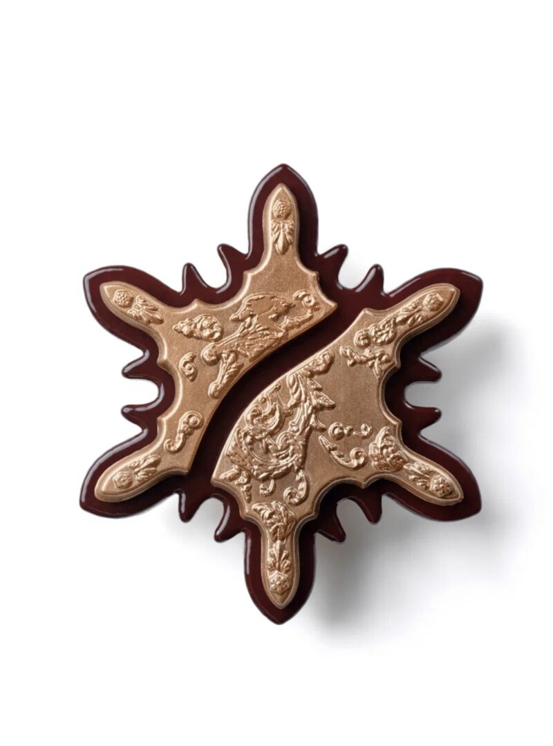 Венчает десерт «Звезда Габриэль» декоративная шоколадная плитка, вид которой напоминаеттекстуру и золотой цвет Кордовской кожи, украшающей стены ресторанного зала. Во вкусе шоколадного украшения угадываются пралине и Флёр де сель. На нем также присутствует едва заметная печать ресторана La Gabriel. Эту шоколадную плитку лучше всего попробовать отдельно от десерта, вместе с кофе.