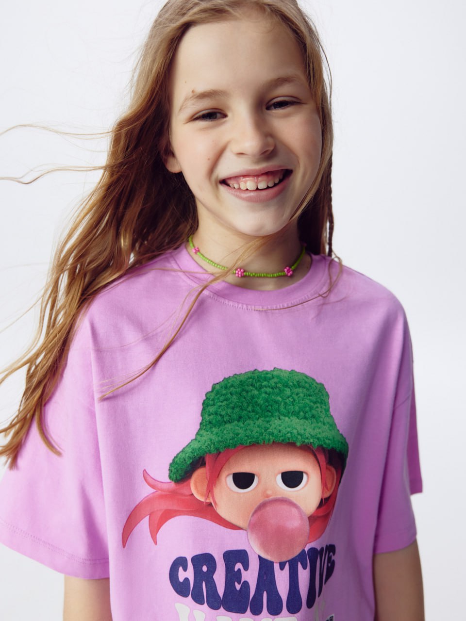 скейтборде, сестры-подростки будут ухаживать за ромашкой в цветочном горшке, а девочка в панаме надует и лопнет розовую жвачку.