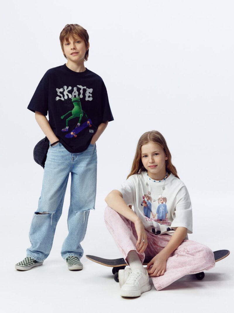В AR-коллекцию вошли 9 футболок и лонгсливов от 122 до 164 размера. Каждую вещь украшает графический принт с озорными персонажами в стиле streetwear и скейтерской культуры. Для активации дополненной реальности необходимо отсканировать с помощью мобильного устройства QR код на изделии. Например, лягушка начнет выполнять трюки на