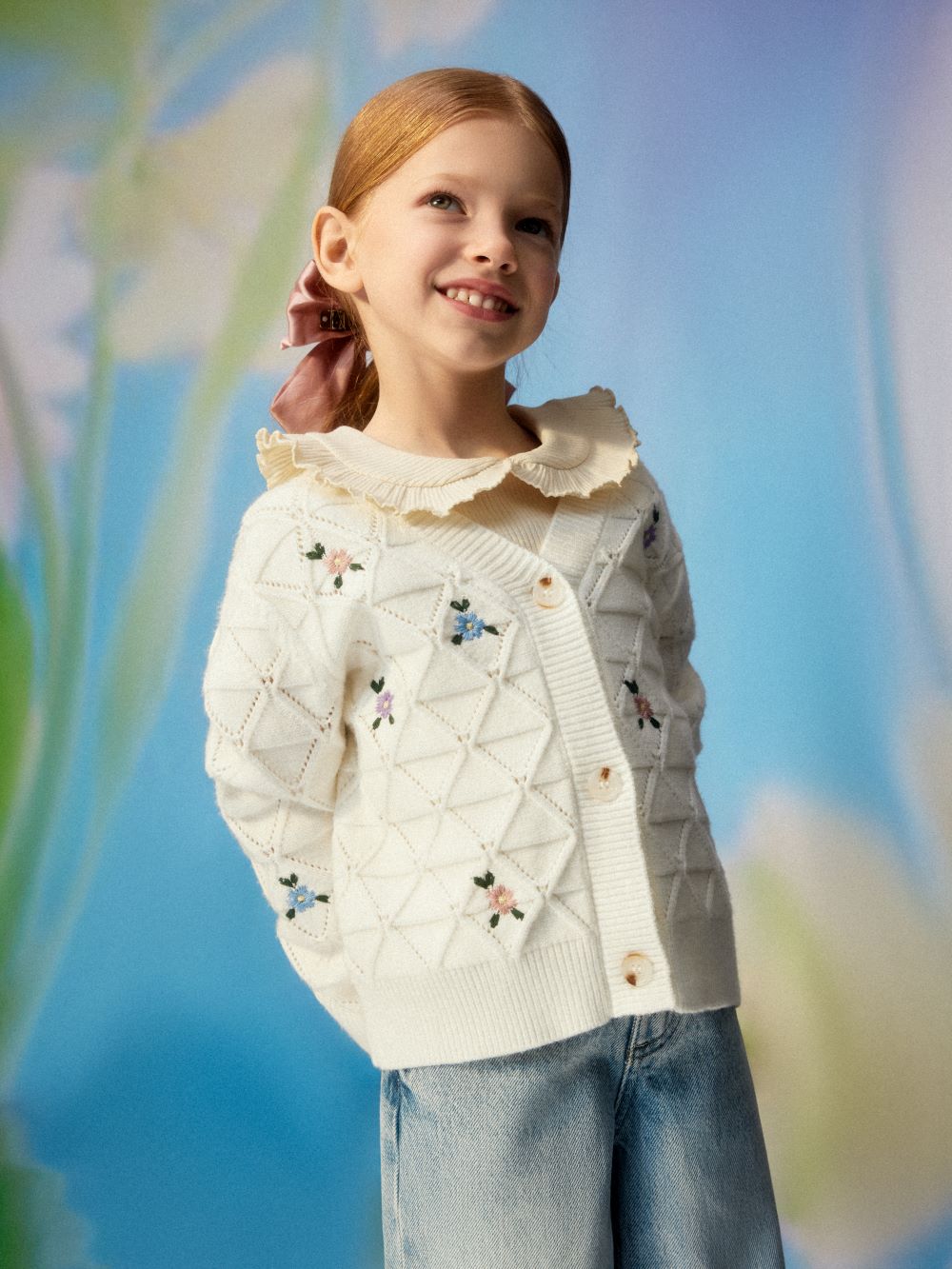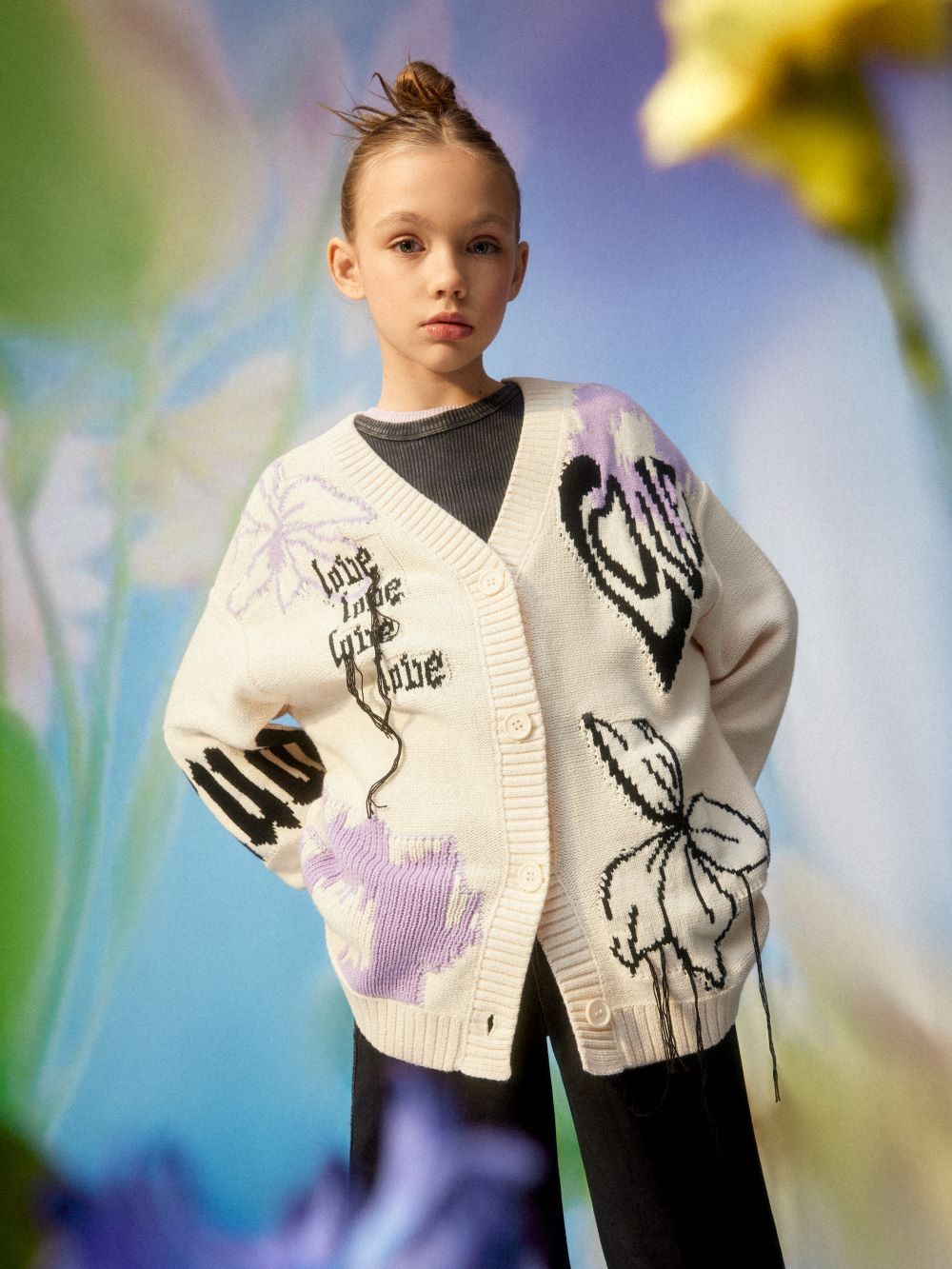 В линейке для девочек представлены футболки и толстовки с колокольчиками, лилиями и пионами в пыльных оттенках, а также кардиганы и милые платья.