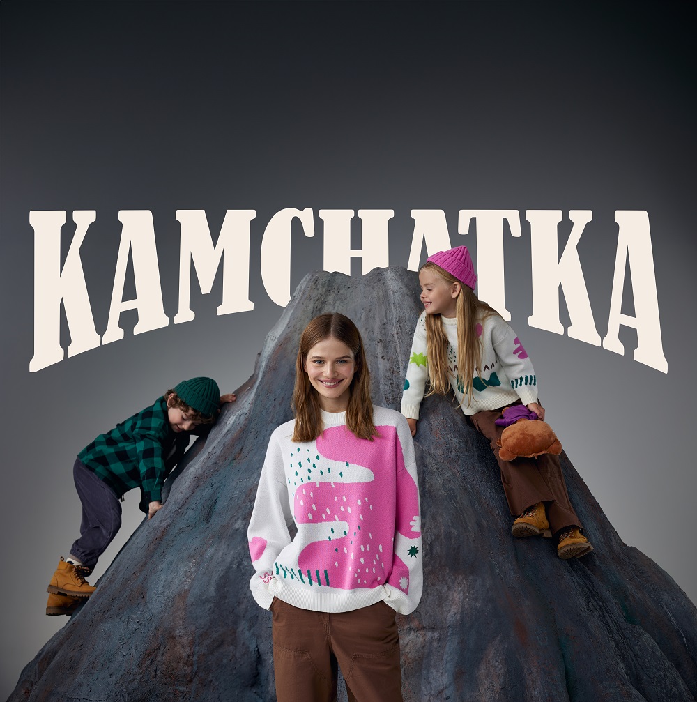 Женская капсула представлена трикотажными костюмами из хлопкового футера с олловерными принтами, уютными чебурашками из мягкого флиса, вязаными джемперами, футболками оверсайз и фланелевыми рубашками в клетку. Также в коллекции есть короткая стеганая куртка с эффектным лаковым покрытием и брюки-парашюты в тон, которые можно носить комплектом. Завершить образ с камчатским настроением можно стильными аксессуарами: носками, шапкой-бини с патчем, шарфом или перчатками.