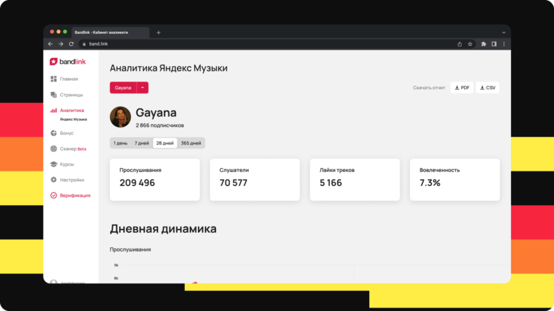 «Как сервис для артистов мы видим задачу в том, чтобы сделать для них процесс продвижения творчества максимально эффективным, понятным и доступным. Для этого мы постоянно улучшаем существующие и добавляем в продукт новые полезные инструменты. В партнерстве с Яндекс Музыкой мы уже запустили программу дополнительного заработка для артистов «Бонус», раздел Сканер, в котором можно быстро получить полную картину поддержки треков артиста в плейлистах. А теперь с запуском нового раздела BandLink с аналитикой у артиста появляется возможность удобно следить за тем, как слушатели взаимодействуют с его треками на Яндекс Музыке», — рассказывает основатель и руководитель Bandlink Дмитрий Литвинов.