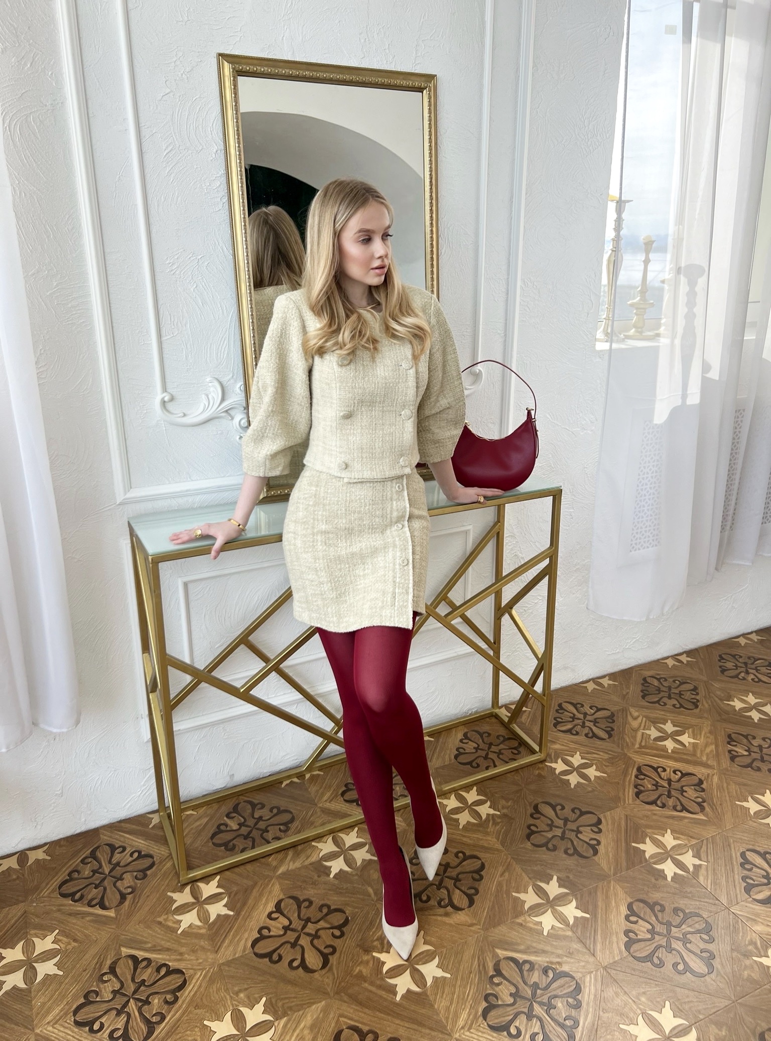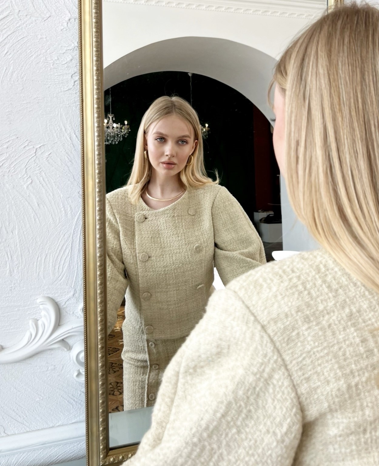 Нарочито строгое платье по фигуре, романтичные, летящие блузы, трендовый твид в благородном золотистом оттенке, нежный микровельвет в брючном костюме классического кроя — образы, в которых хочется встретить весну и создавать как можно больше поводов для выходов из дома!