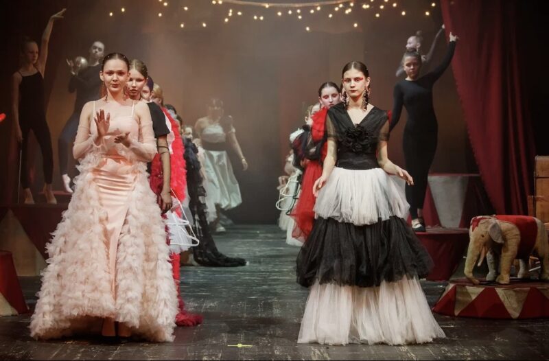 Старинный театр и цирк – концепция мероприятия. Дефиле моделей сопровождалось акробатическими фигурами юных гимнасток.