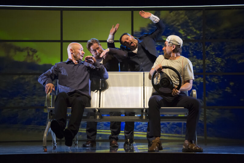 Действие спектакля происходит в зале ожидания аэропорта, где встречаются два лучших друга, у которых всегда было слишком мало времени для того, чтобы встретиться и сказать такие важные друг другу слова. Но теперь оно есть. Один из друзей, которого играет актер Александр Носик, недавно ушел из жизни. А второму, в исполнении обаятельного Григория Данцигера, не терпится узнать, что же там – за чертой.