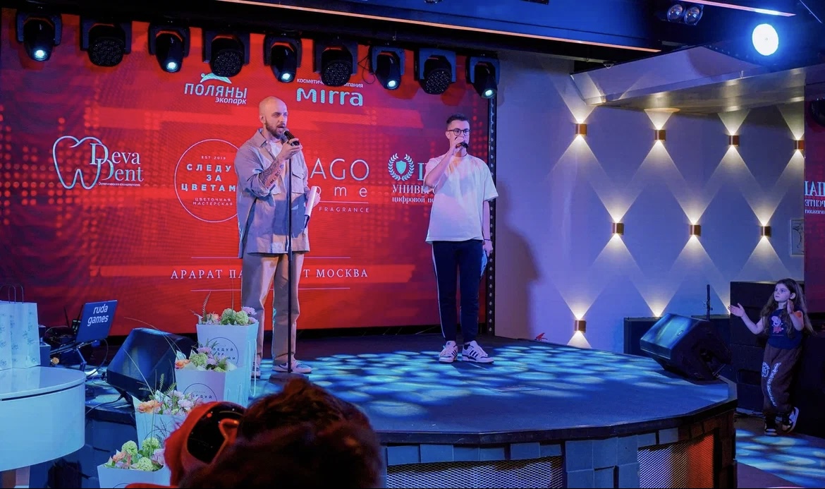 ​ Без подарков этим вечером не остались и ведущие музыкального КВИЗа. Туристический комплекс «Экопарк Поляны» пригласил в гости Александра Степанова или ST- участника популярного интернет-шоу Versus Battle, поэта и основателя проекта #superСТИХИ, и Антона Самойлова, ставшего для многих настоящим открытием. Молодой исполнитель из Белгорода, или музыкальный персонаж, как он сам себя называет, взорвал зал исполнением песен из сериала «Слово пацана» и точным попаданием в образ его главного героя — Вовы Адидаса. Генеральный менеджер отеля «Арарат Парк Хаятт Москва» Оксана Масюкова вручила Самойлову сертификат на проживание в люксе в качестве приза зрительских симпатий.
