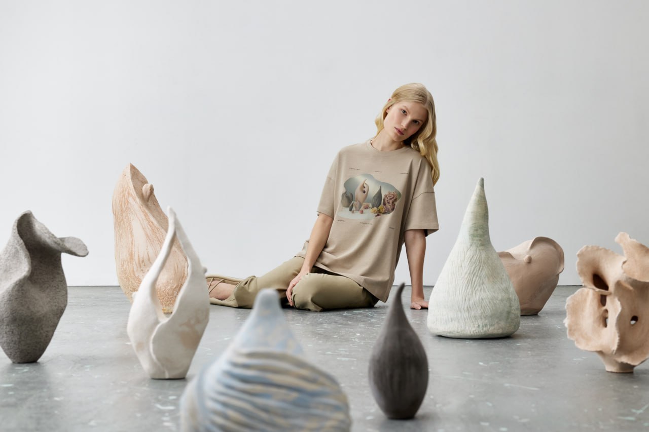 Капсула sela x Юлия Menadel состоит из хлопковых женских футболок оверсайз, которые впишутся в любой аутфит теплого сезона. Хлопковый шопер и носки с принтом по мотивам скульптур Юлии отлично дополнят базовый образ.