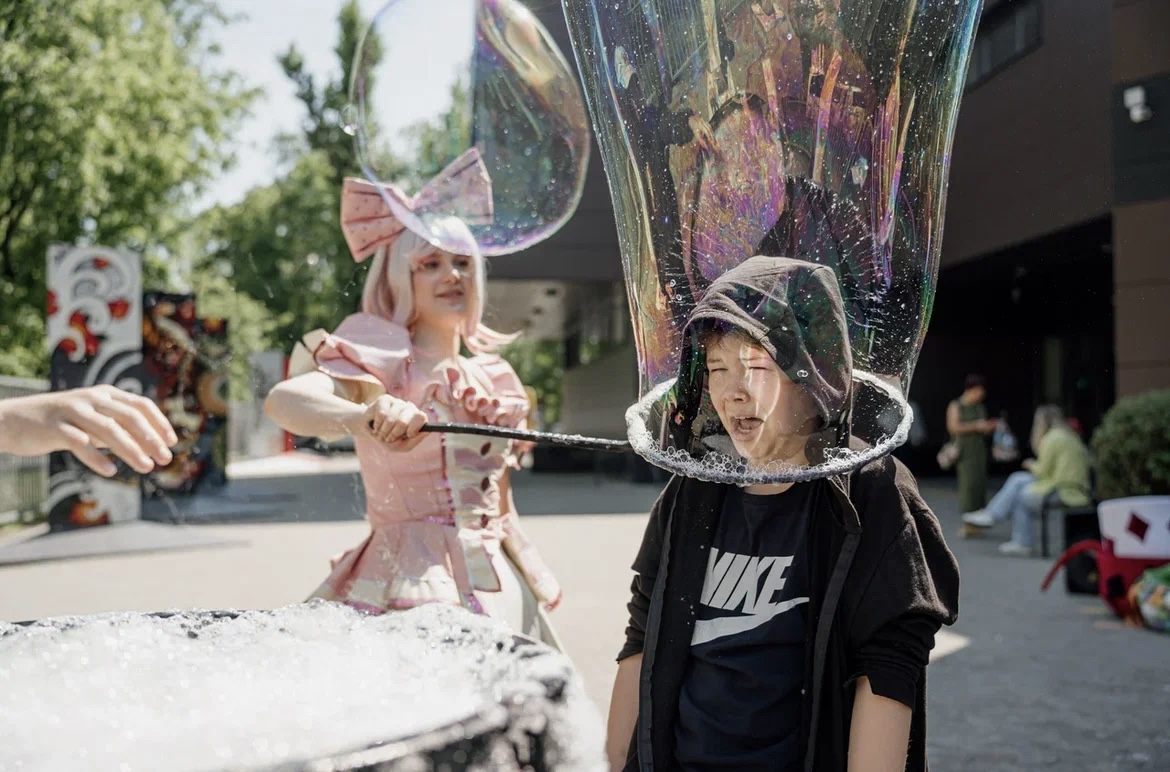 В этом фестиваль посетили 1500 детей и родителей. Перед началом мюзикла их развлекали веселые аниматоры, можно было сделать аквагрим и поучаствовать в захватывающем химическом шоу. Хорошее настроение гостям создавал ведущий мероприятия Кирилл Лопаткин. По многочисленным просьбам в этом году мюзикл «В погоне за счастьем» был показан заново, поскольку не все его успели посмотреть в прошлом году. А история стоит этого! Происходит она в самом обычном городе, с самыми обычными людьми при самых обычных обстоятельствах. Два героя встретились, чтобы понять, что такое счастье. Случайная встреча людей с разным прошлым, вынудила одного из них пересмотреть взгляды на жизнь. Эту философско-музыкальную историю о поиске смысла на извечный вопрос рассказали артисты Центра развития детей «ИМЕНА Продакшн», самым юным из них было по 3-4 годика. Взрослых героев мюзикла представили мастера сцены: Георгий Перадзе — актёр театра и кино, артист театра Н.С. Михалкова и Сергей Дорогов, актёр театра и кино, участник юмористического шоу «6 кадров». В поисках ответов на свои вопросы герои постановки обращаются к произведениям отечественных поэтов. Со сцены, создавая незримую связь между поколениями, прозвучали стихи Роберта Рождественского, Михаила Гуликова, Бориса Пастернака и Евгения Евтушенко. Мысли и переживания героев помогли прочувствовать музыка Петра Чайковского, Сергея Рахманинова, Родиона Щедрина и Альфреда Шнитке. Оригинальный сценарий мюзикла написан режиссером, креативным продюсером сериалов «Контейнер», «257 причин, чтобы жить» Алексеем Ляпичевым.