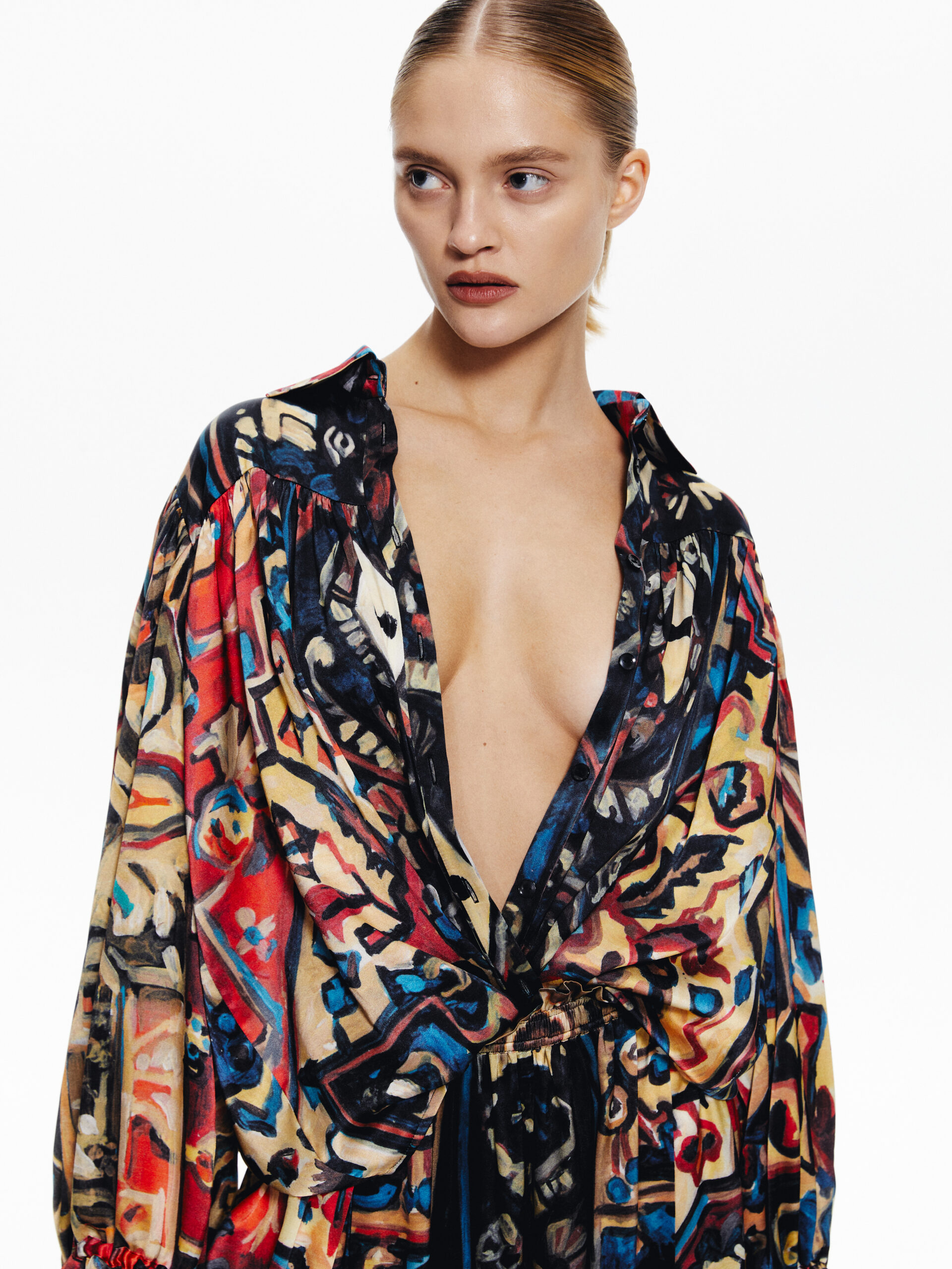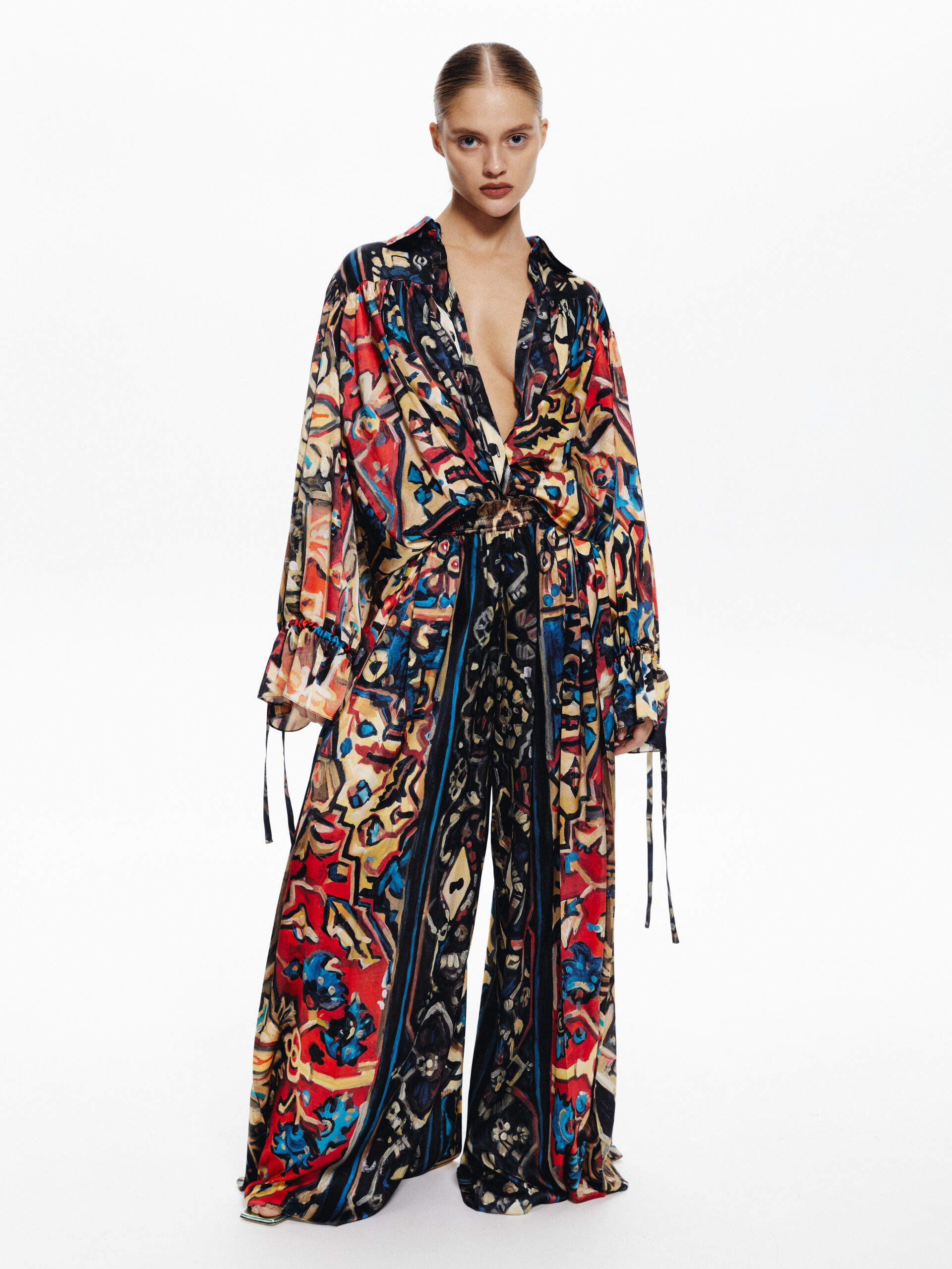 Брюки и жакет из натурального шелка отсылают нас к роскошной восточной стилистике. Выбирая это наряд для новогодней ночи, вы продемонстрируете свою неординарность, артистизм и страсть к искусству.