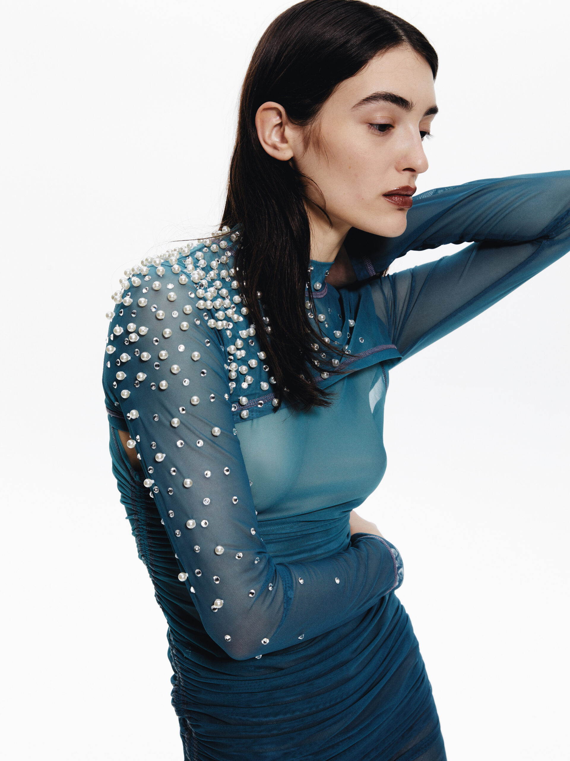 Обтягивающее мини-платье, украшенное декоративными «жемчужинами», — лучший выбор для встречи наступающего года Змеи. Дополните его туфлями на каблуке в тон или, нарушая все правила, — высокими сапогами контрастного цвета.