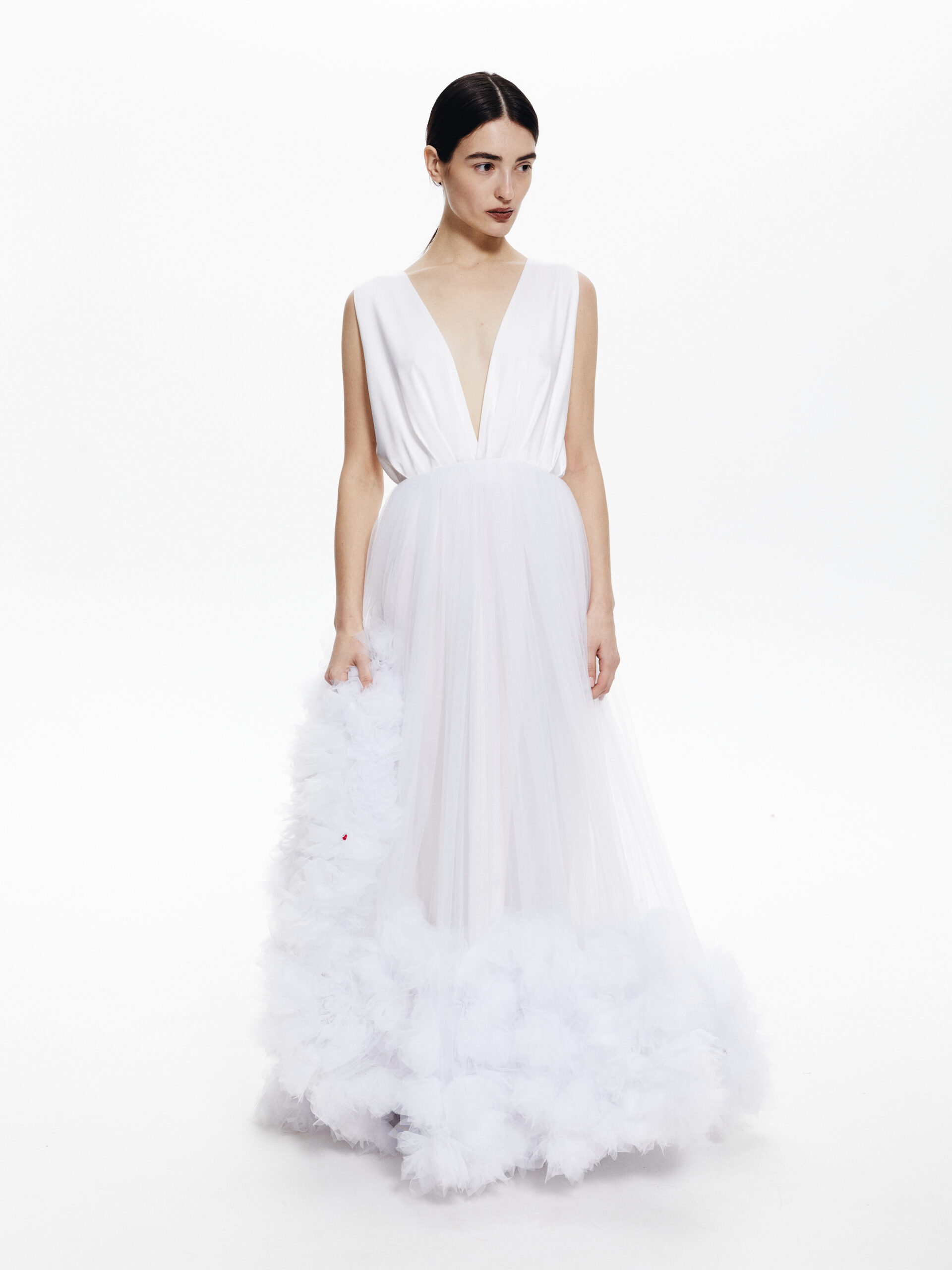 Нежнейшее платье из шелка напоминает наряд волшебной девы, появляющейся из глубины моря и белоснежной морской пены. Этот изысканный наряд, дополненный выразительными деталями сделает вас главной героиней любого вечера.