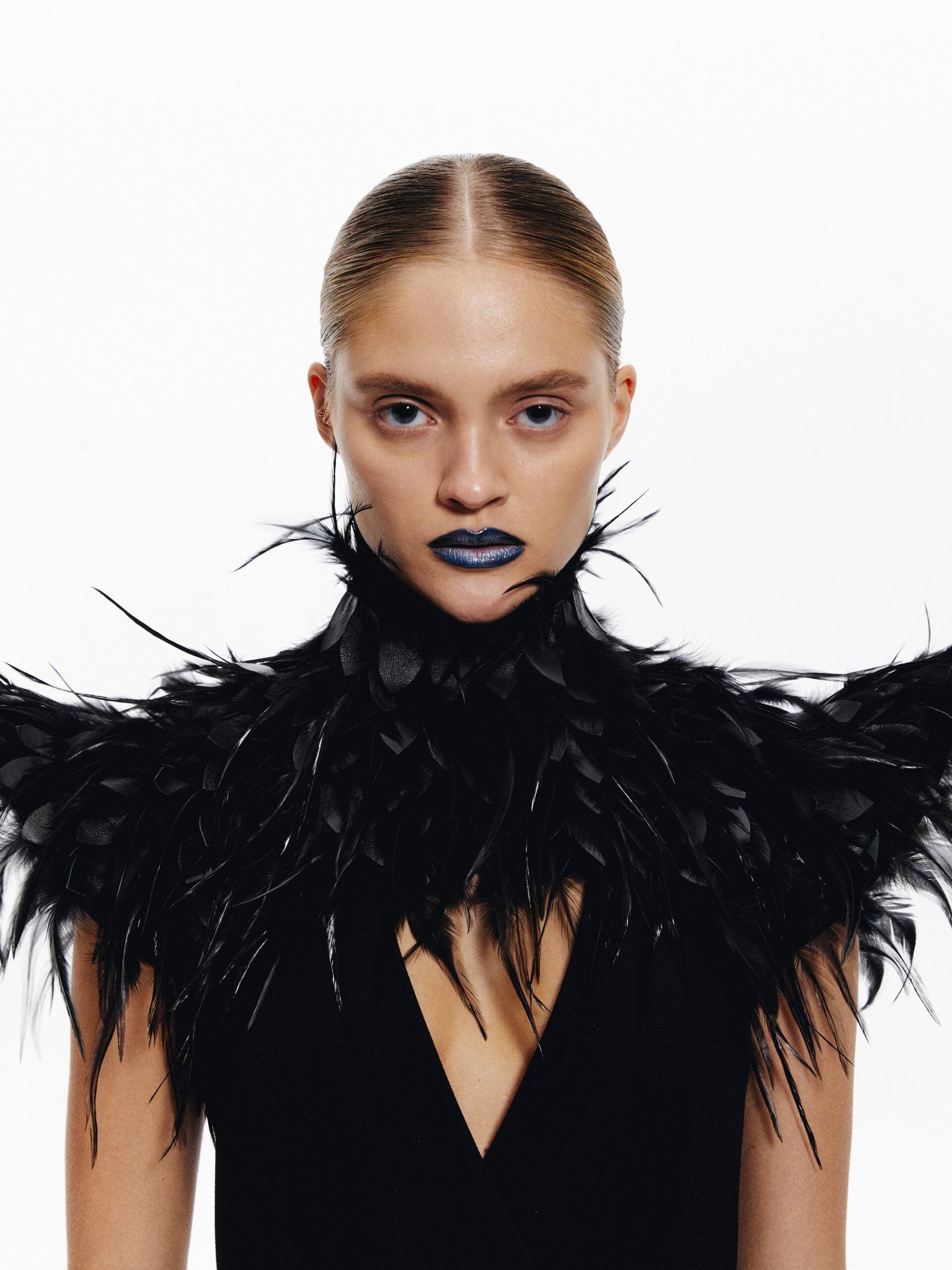 Черный комбинезон со смелой линией декольте и пышным болеро из перьев