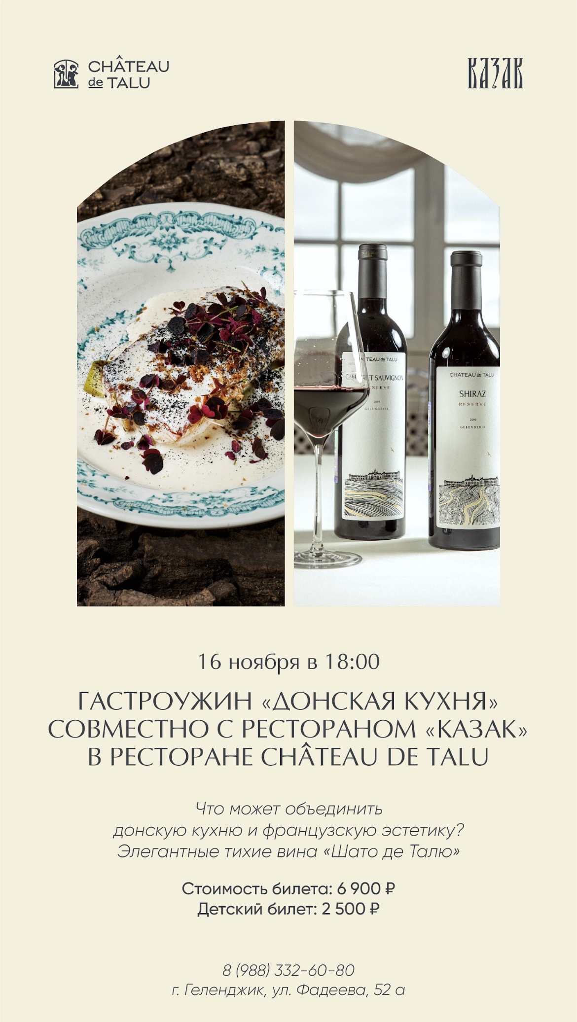 16 ноября в 19:00 состоится гастрономический ужин «Донская кухня». Два шефа — шеф-повар Château de TaluСергея Куприянова и шеф-повар ресторана «Казак» Александр Шкруднев из Ростова-на-Дону презентуют семь авторских курсов, каждый из которых сопроводят вина тихие сухие вина Шато де Талю.