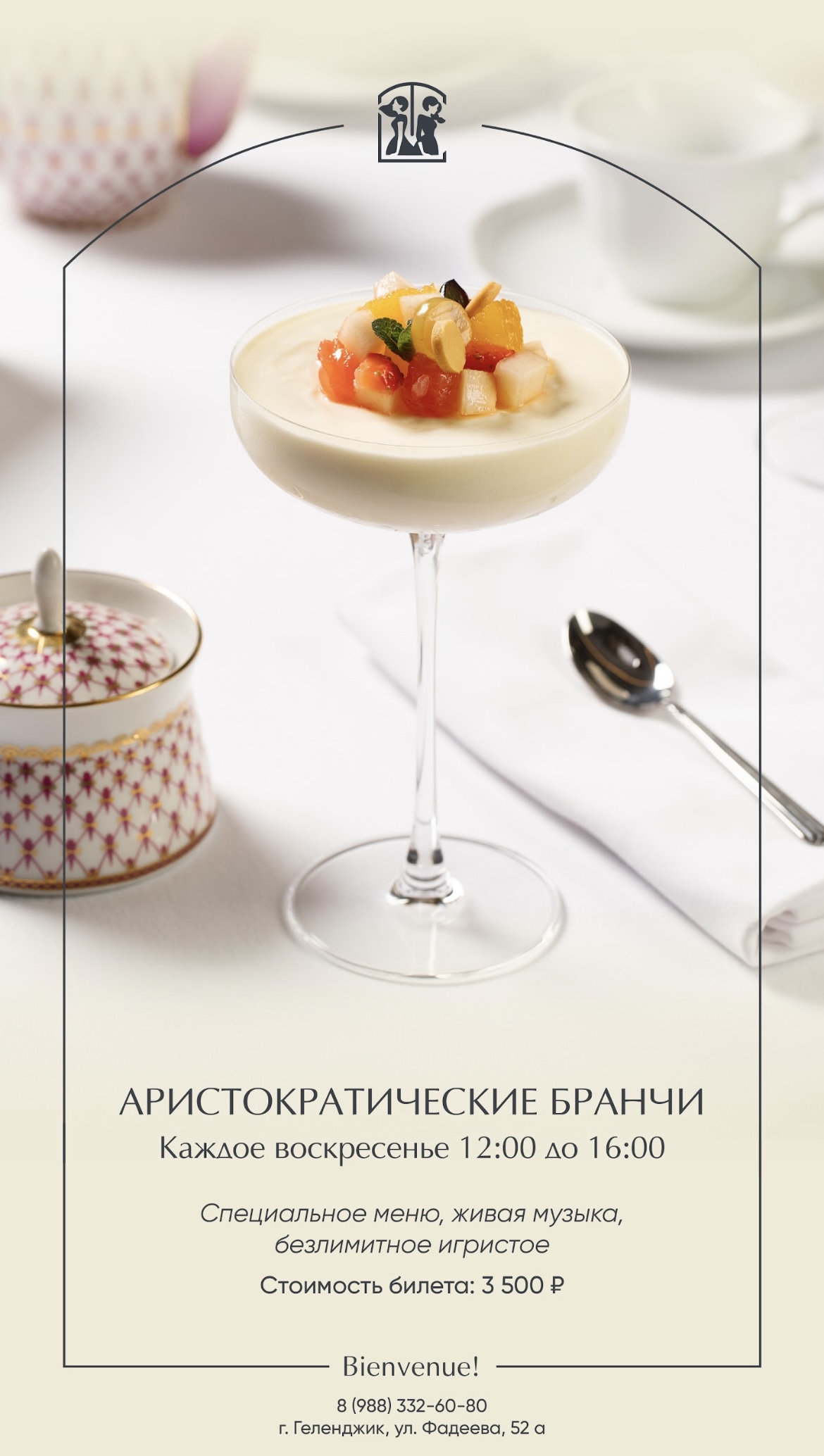 Каждое воскресенье c 12:00 до 16:00 проходят аристократические бранчи с безлимитным игристым и живой музыкой.