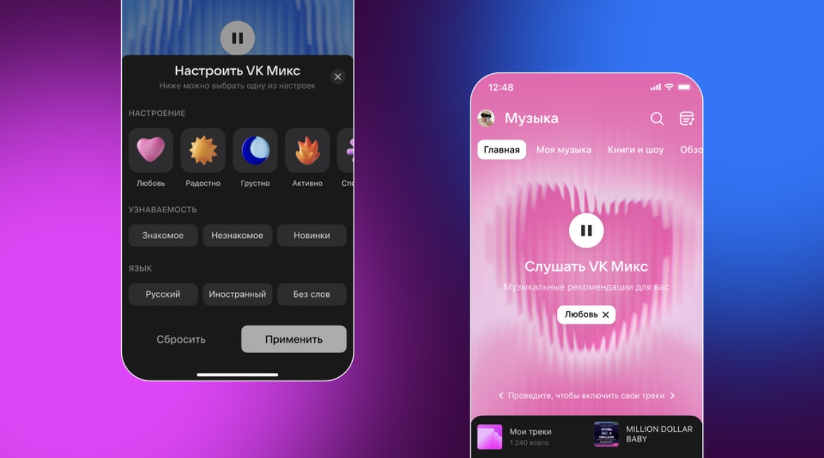 Система рекомендаций стала быстрее и точнее — алгоритмы подстраиваются под вкусы пользователя после прослушивания нескольких треков и реакции на них. В результате пользователи стали на 40% чаще добавлять треки из VK Микс к себе в плейлисты. Ещё одной особе нностью обновления стала возможность настроить поток рекомендаций треков по настроению: «активно», «грустно», «спокойно», «радостно» и «любовь», узнаваемости и языку, на котором исполняется песня.