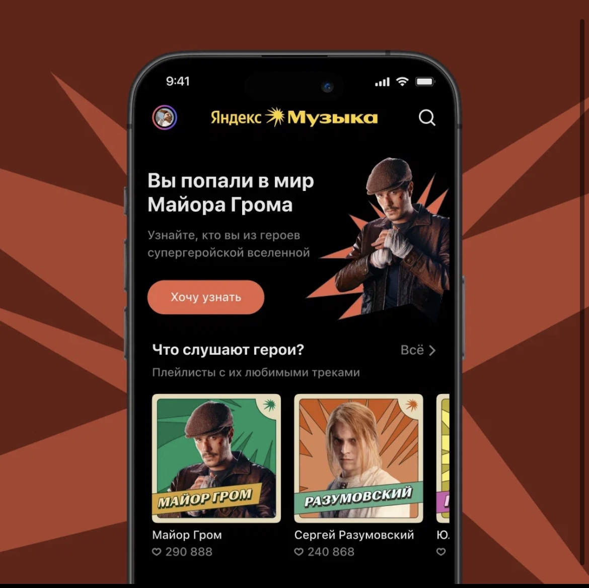 Специально к премьере блокбастера «Майор Гром: Игра» Яндекс Музыка запустила раздел с контентом из вселенной Майора Грома. Помимо оригинальных саундтреков, в нем представлены комиксы и подкасты по франшизе, плейлисты с аудио-комментариями от героев картины Игоря Грома, Юлии Пчёлкиной, Димы Дубина, Марии Архиповой и Отто Шрайбера, а также игра «Кто ты из вселенной Майора Грома?», в которой пользователи смогут определить персонажа по персональному цвету Моей волны.