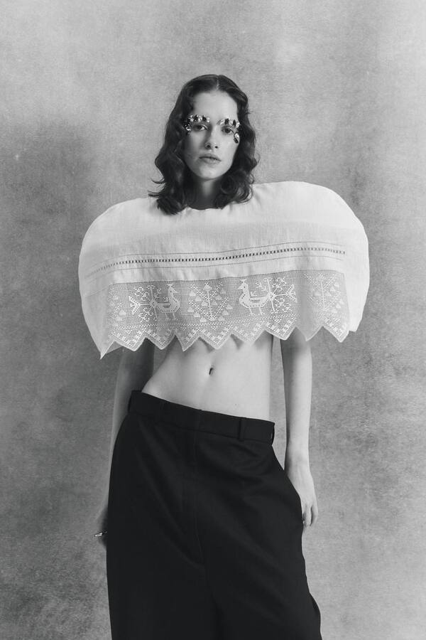 Кира Орлова, постоянный участник дефиле приготовила коллекцию «Эхо». «Эхо» — это как отголосок времени, где на окнах в горнице висели занавески с вышивкой, а комоды и столы украшали вязаные салфетки. «Главным стремлением было научиться вручную создавать Тарусскую перевить и сохранить традиционную вышивку, — рассказывает дизайнер.